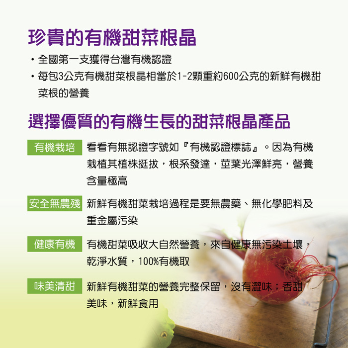 ◆嚴選有機甜菜根及數種穀類等數種營養健康食材,經過繁複工法製作