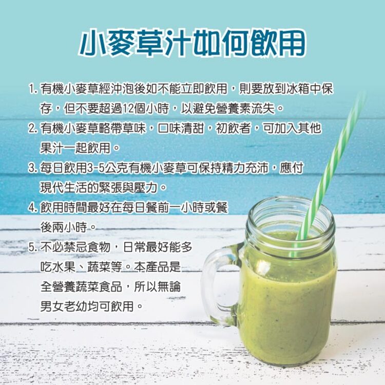 建議食用方法:早上空腹或每日餐前,加入1-3匙(1匙約1公克)有機小麥草汁粉加入250ml(建議